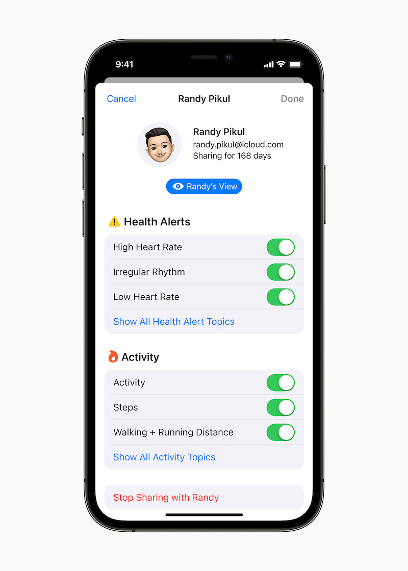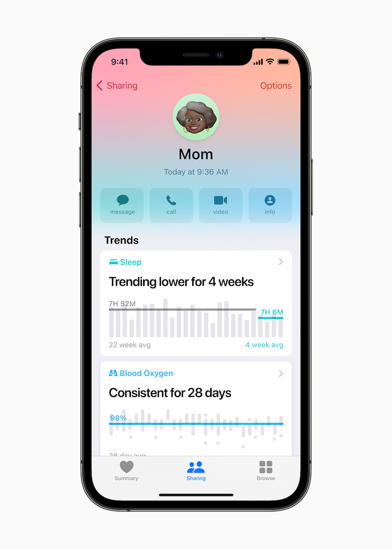 经过 iOS 15,用户能够挑选让挚亲安全地检查自己的健康与保健材料,以及继续追寻重要的告诉及改变,即便分隔异地,都可依据健康情况进行深化交流并给予支撑。