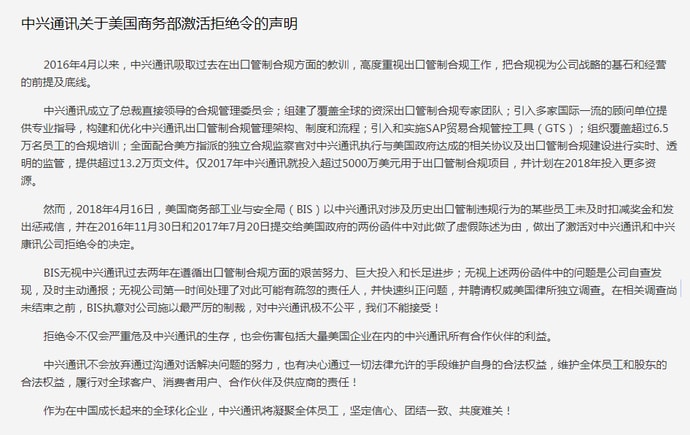 中兴通讯就美国商务部制裁发声明:不能接受!