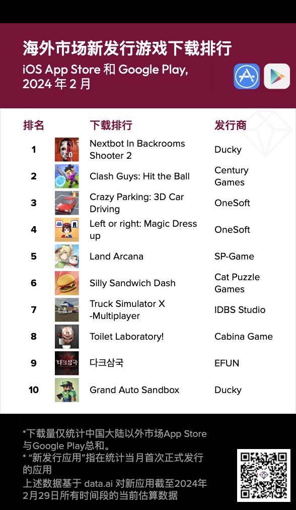 依据 data.ai 发布的 2024 年 2月海外新运用下载榜,本期共有 12 款新游戏运用,6 款新非游戏运用下载量打破 100 万。榜单榜首名分别是PvE射击游戏 Nextbot In Backrooms Shooter 2,以及个性化东西 Funny Emoji。
